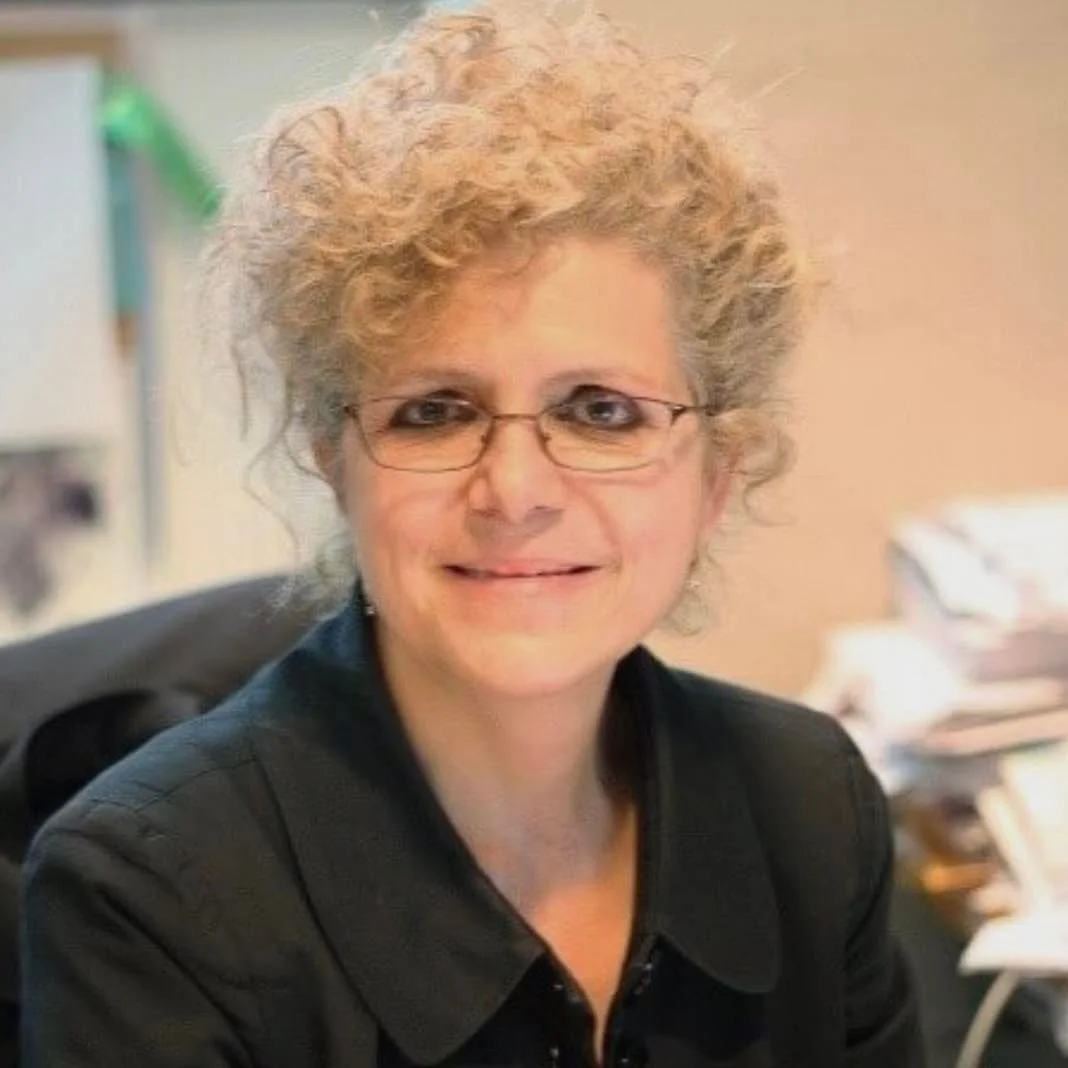 A person with curly hair and glasses, wearing a dark jacket, seated indoors, with papers on the desk in the background.