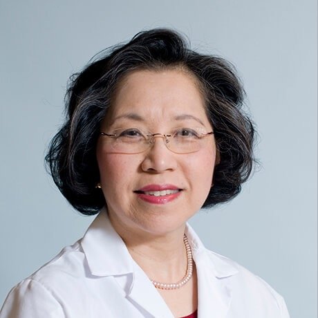 A woman wearing glasses and a white lab coat, smiling with short black hair, set against a plain background.